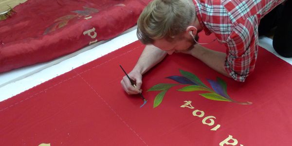 Läs merEn ny fana tillverkas som ersättning till en som skadats i en brand. På ett nytt sidentyg kopieras den gamla fanans mönster i färg och bokstäverna med bladguld. Handarbetes vänner i Stockholm kommer sedan att sy ihop fanan och sätta fransar längst kanterna.