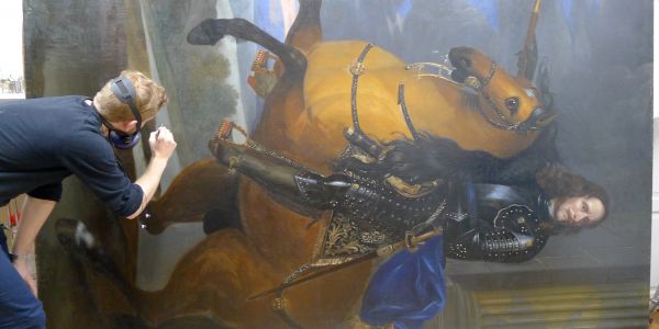 Den stora målningen som föreställer Carolina vid cavaletten var mycket sliten. Spjälkande färg återfästes och hål i duken lagades med dukintarsia samt den trasade kanten på två av målningens kanter förlängdes och förstärktes med remsor av linneduk som limmades fast. En gulbrun ojämn fernissa togs bort och ersattes av en ny klar fernissa. Skador i färgen och ojämnheter i duken som inte hotades att förvärras och vilka berättade om målningens historik lämnades utan åtgärder, t ex vikveck efter målningens färd från Rom där den målades och till Gotland.